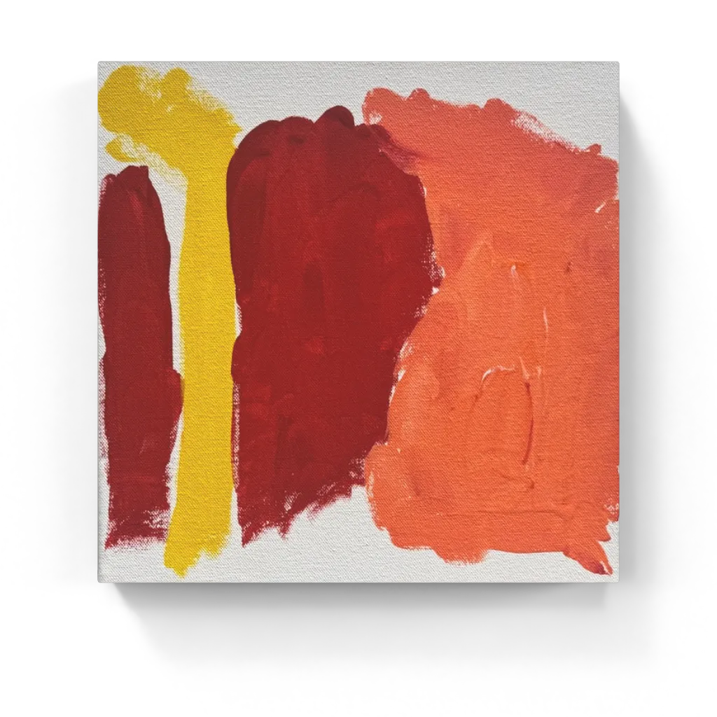 Autumn Columns is a quietly powerful abstract painting made of three broad bands of color: deep red, golden yellow, and soft orange standing side by side on a white background. Bethany brushed each block in confidently, letting the edges stay slightly irregular so the colors feel alive and hand-made rather than perfectly straight. The warm palette suggests fall leaves, sunsets, or the glow of a cozy fire, bringing a sense of comfort and stability to the piece.