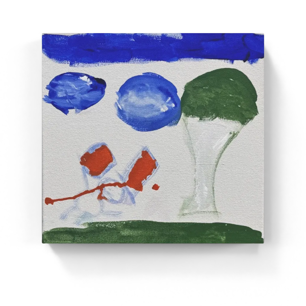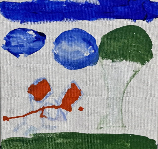 Blue Ball Park is a gentle, playful scene with a tall green tree on one side, a band of deep blue sky at the top, and soft green grass along the bottom. In the middle, Muricel added two round blue shapes that feel like bouncing balls or clouds drifting by, along with loose red-orange marks that hint at people or playground equipment. The open white space around the forms gives the painting a light, airy feeling, like a quiet afternoon at the park with just a few favorite things in view.