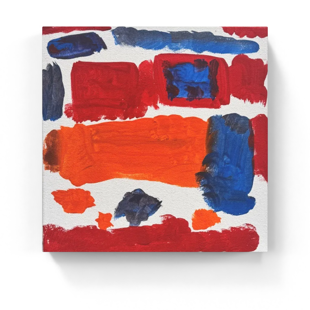 Firecracker Blocks is a dynamic abstract painting made of bold red, orange, and deep blue shapes scattered across a bright white canvas. Matt brushed each block in with confident strokes, letting the edges stay a little rough so the colors feel like they’re buzzing and sparking against one another. The big band of orange in the center anchors the piece, while the smaller blue and red shapes dance around it like little bursts of energy.
