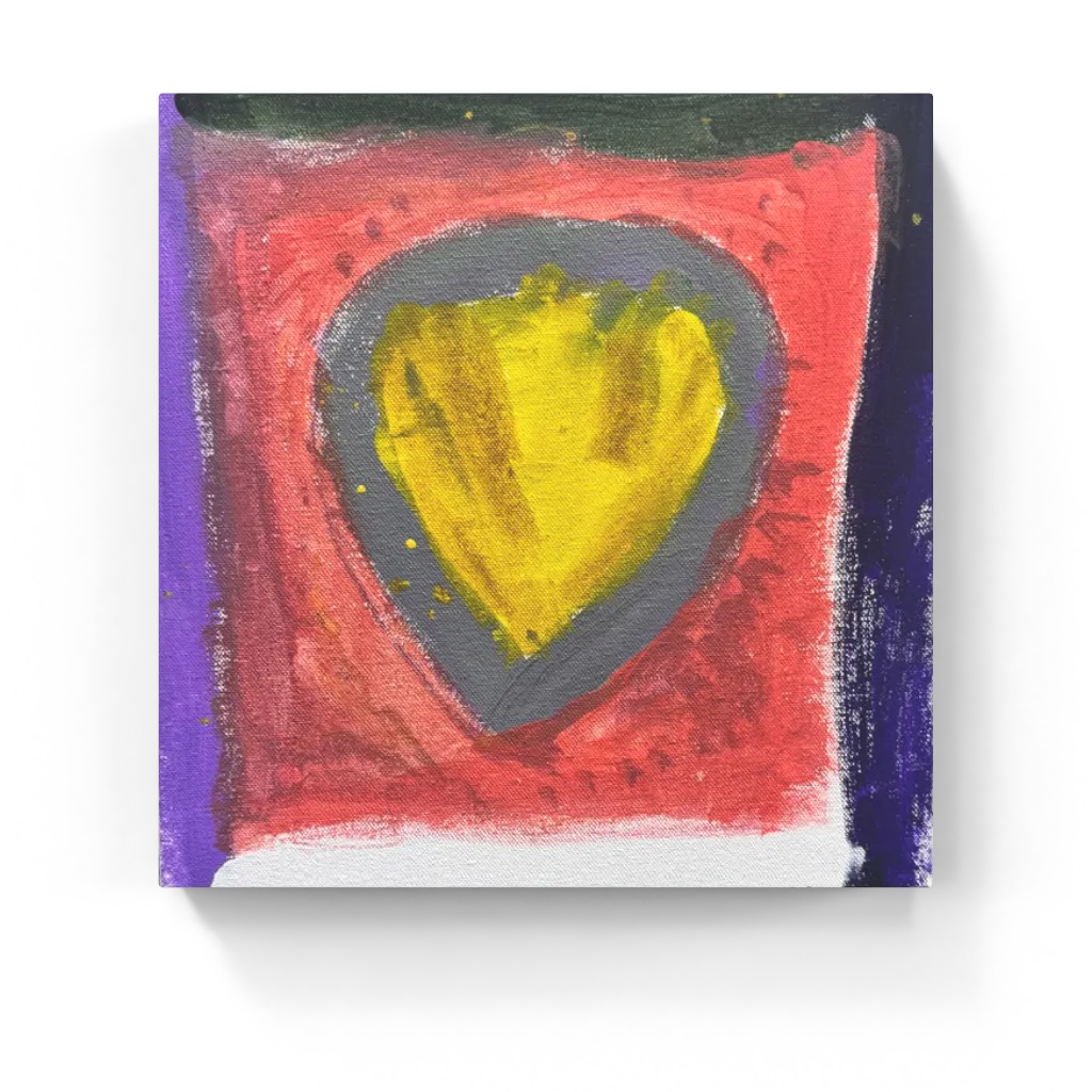 Heart of Gold is a warm, glowing painting centered on a bright yellow heart nestled inside a soft gray outline and framed by deep red, purple, and dark green edges. Elizabeth N. layered the colors with loose, expressive brushstrokes so the heart almost seems to shine from within its colorful border. The contrast between the glowing center and the darker, textured background gives the piece a strong, comforting presence—like a little reminder of love hanging on the wall.