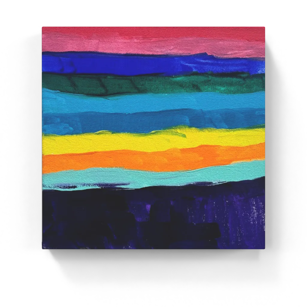 Rainbow Horizon is a striking abstract landscape made from layered bands of color with deep violet at the bottom, rising through aqua, orange, yellow, teal, green, rich blue, and soft pink at the top. Mackenzie brushed each stripe in thick, confident strokes so the edges ripple and overlap, like different horizons laid one on top of another. The result feels a little like sunset over the Gulf and a little like a rainbow, all compressed into one glowing stack of color.