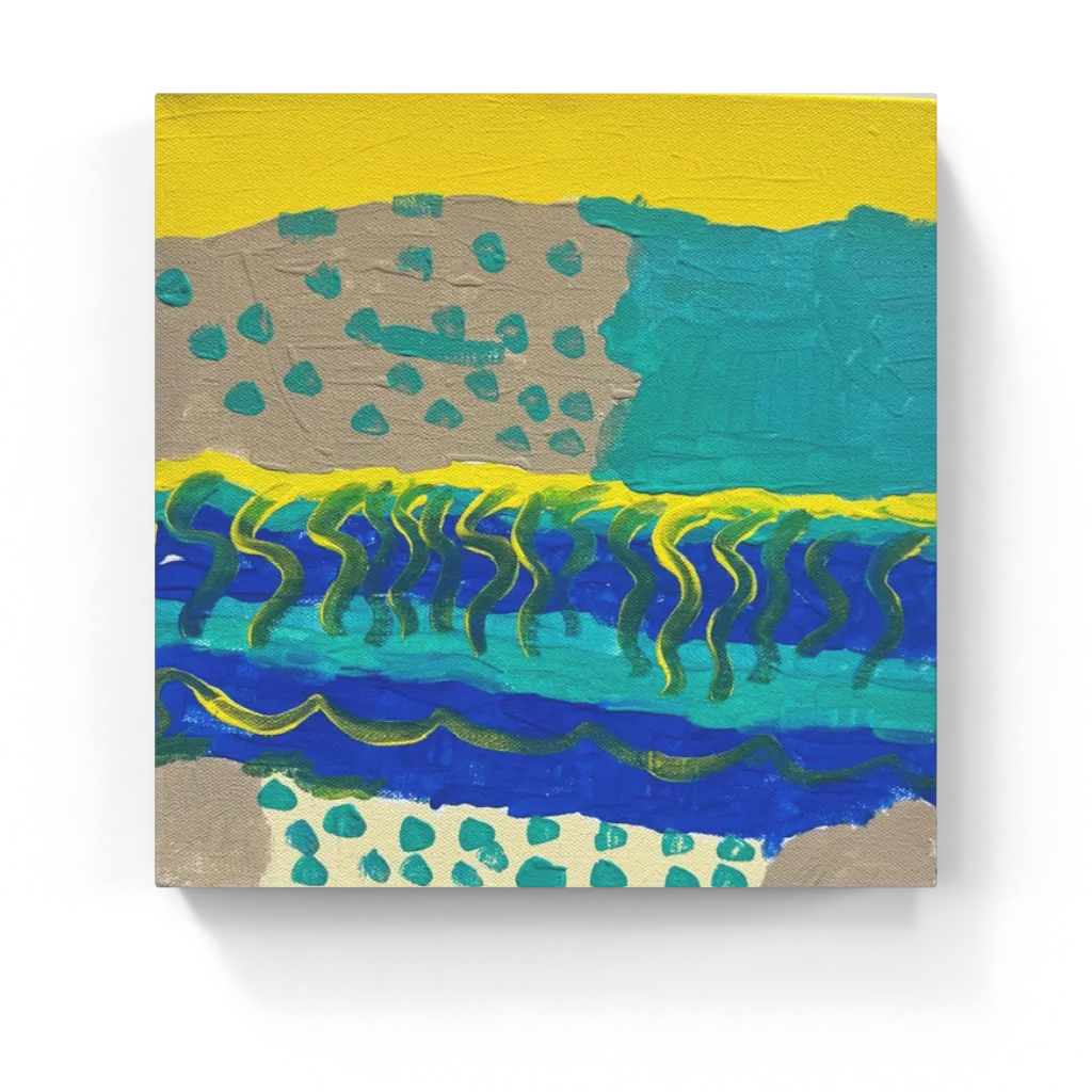 Seagrass Shoreline is a lively coastal painting filled with stripes and patterns—soft tan sand with teal dots, bands of turquoise and deep blue water, and a bright yellow strip where wavy lines of green and yellow rise like seagrass in the surf. Megan topped the scene with blocks of sandy beige and teal under a yellow sky, so the whole canvas feels like an aerial view of the beach turned into a graphic design. The repeating dots and squiggles give the piece a rhythmic, almost musical quality that’s both relaxing and fun.