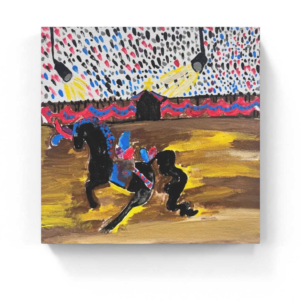 Showtime Stallion is a dynamic arena scene featuring a prancing black horse decked out in bright blue, red, and pink decorations under a dazzling sky of colorful dots and spotlights. Ellie filled the ring with warm golds and browns so it looks like the ground is glowing beneath the horse’s hooves, while a row of bunting and a little center building in the background make the whole place feel like a festive show or circus. The curved tail, raised legs, and dramatic lighting capture that moment when all eyes are on the performer — confident, bold, and full of energy.