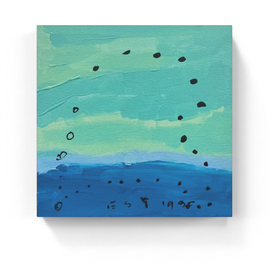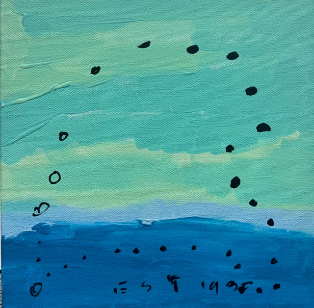 Sky Dance is a calm coastal painting in soft shades of turquoise and deep blue, with a line of dark dots arcing gently across the sky and scattered along the water below. Dylan brushed the sea in layered blues and topped it with a pale band of distant horizon, then added the dots like birds, stars, or bits of sea spray drifting on the breeze. The simple shapes and limited palette make the piece feel peaceful and meditative, like watching the Gulf on a quiet day and noticing every little movement.